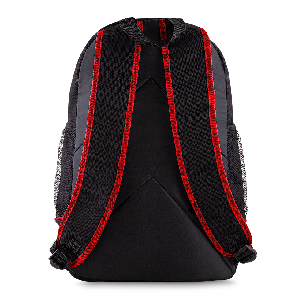 Parte externa: Dois bolsos laterais em malha. Bolso central. Alça de ombro e mão. NÃO TEM PORTA NOTEBOOK