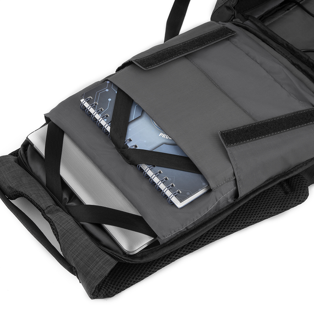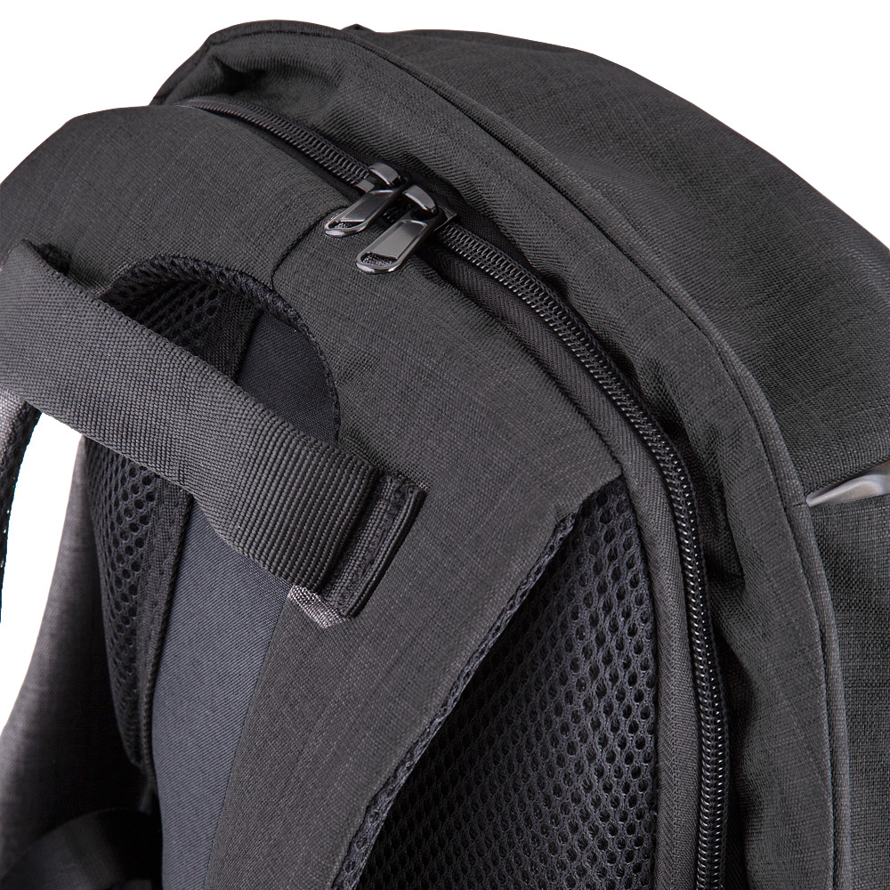 Mochila para notebook antifurto. Tecido poliéster toda forrada. Parte externa: Zíper protegido. Um mini bolso com ziper na alça de ombro, ideal para dinheiro e cartões. Alça para mala de viagem. Faixa refletiva noturna na parte externa. Parte interna: Bolso interno para celular. Um bolso para tablete. Bolso interno com zíper. Compartimente acolchoado para notebook, 33x25cm. Cinto elástico nas repartições internas.