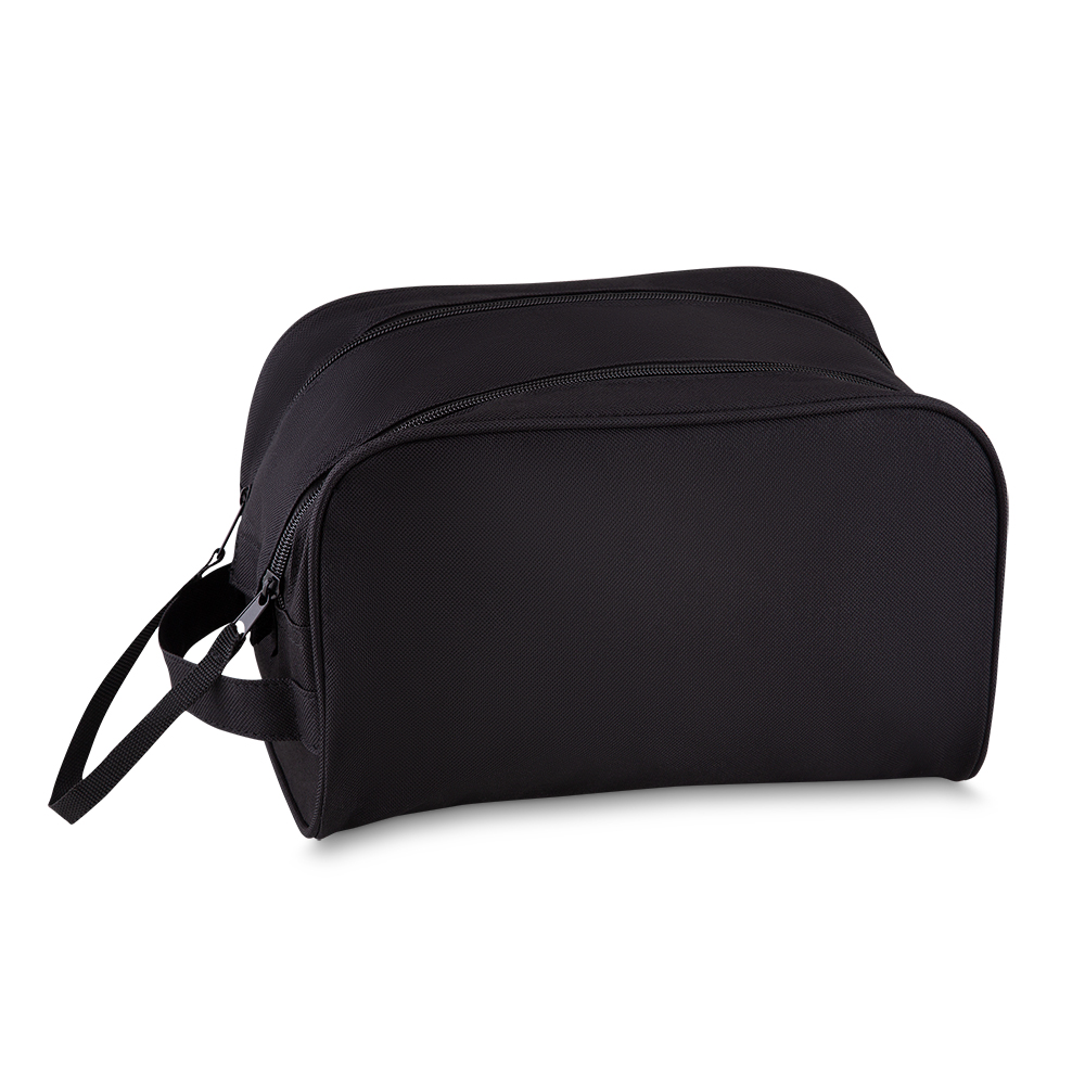 Necessarie tecido poliéster 300, cursor duplo para fechamento com alça, trava com velcro, alça de mão, gravação Frontal.