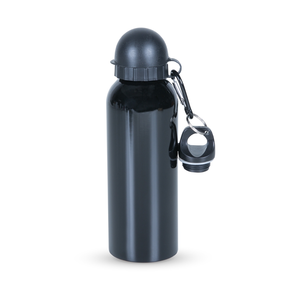 Squeeze 500ml de alumínio com pintura metalizada, tampa rosqueável e acompanha um segundo bico com mosquetão (não é térmico).