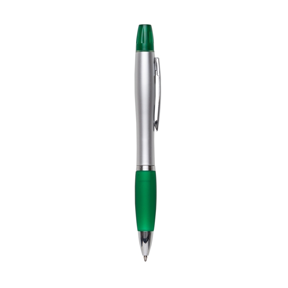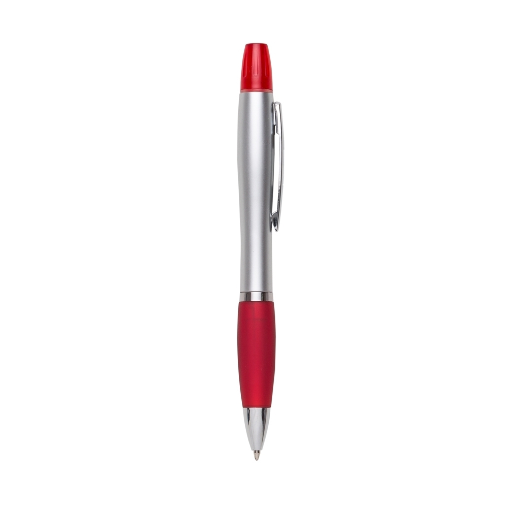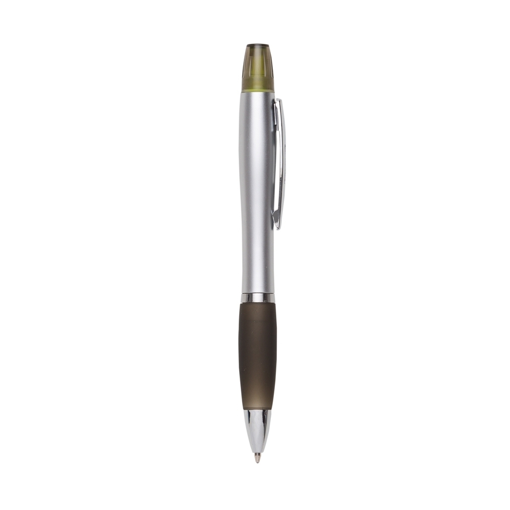 Caneta plástica com marca texto, corpo prata com anel inferior e detalhe emborrachado colorido. Clip metálico com detalhe vazado no centro, possui tampa plástica para o marca texto. Aciona por giro.