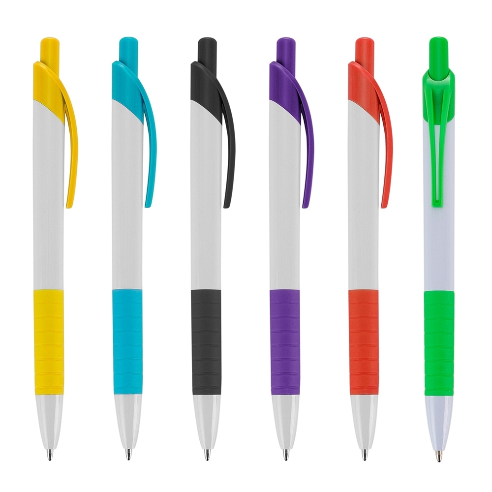 Caneta plástica branca com detalhes coloridos. Clip plástico possui detalhe vazado e parte inferior possui detalhe emborrachado com relevo. Aciona por clique.